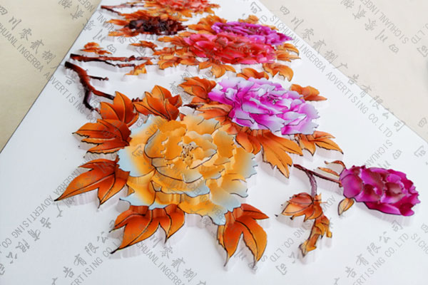 這里我們雕刻的是一幅《花開富貴》的裝飾畫,采用亞克力浮雕制作工藝上色,顏色鮮艷,花朵形象立體,是室內(nèi)裝飾畫制作不錯(cuò)的選擇。