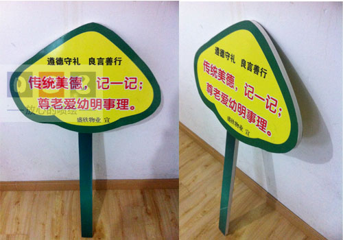 制作的方式有很多,這里我們有兩種制作工藝。牌子采用PVC雕刻裱背膠,支架采用不銹鋼制作,這類制作工藝支架不易